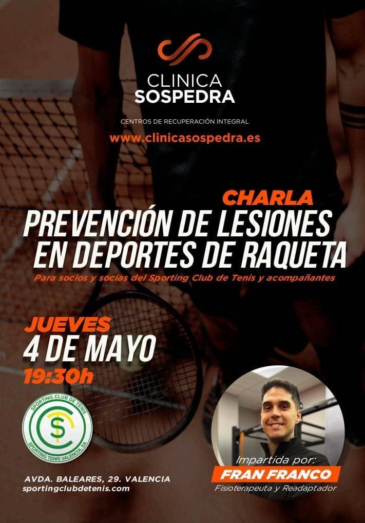Estimados socios, aprovechando el inicio de nuestra colaboración con la Clínica Sospedra, a la cual damos una gran bienvenida a la actividad habitual de nuestro club, hemos pensado conjuntamente organizar una charla que pudiera interesar a todos nuestros jugadores tanto de tenis como de pádel y a la que seguirán otras de distinto contenido.