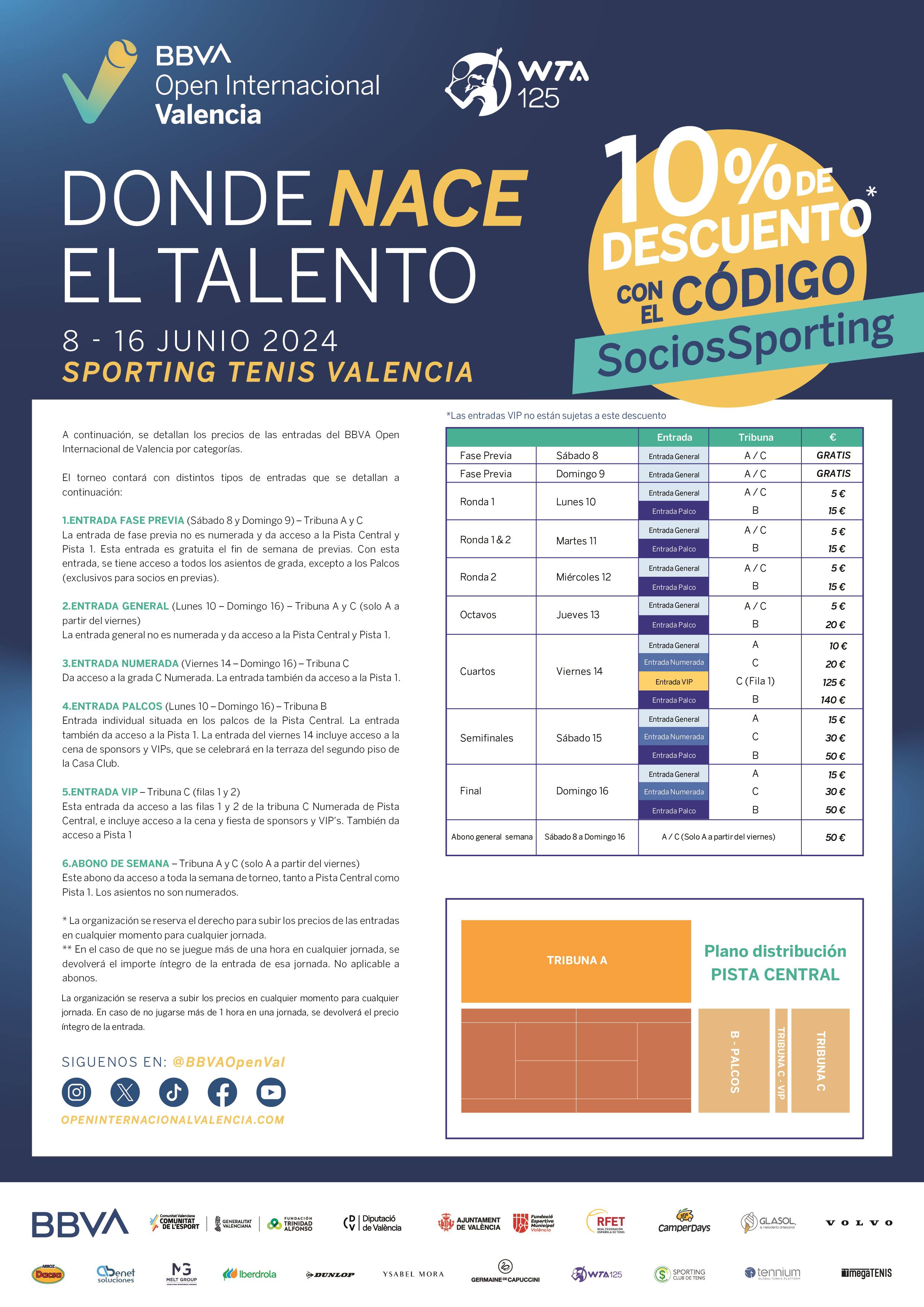 Podéis comprar las entradas para el resto de gradas en la página web de la organización del Torneo WTA 125 BBVA OPEN INTERNACIONAL DE VALENCIA (proticketing.com) con un descuento del 10% como socios (introduciendo “Socios Sporting” en la casilla “Código de descuento”) con el límite de 4 entradas por socio y día. Los dos días, sábado 08 y domingo 09 de junio, en los que se disputa la fase previa las entradas serán gratuitas, aunque igualmente habrá que obtener las entradas en esta misma página web para las gradas de la organización.